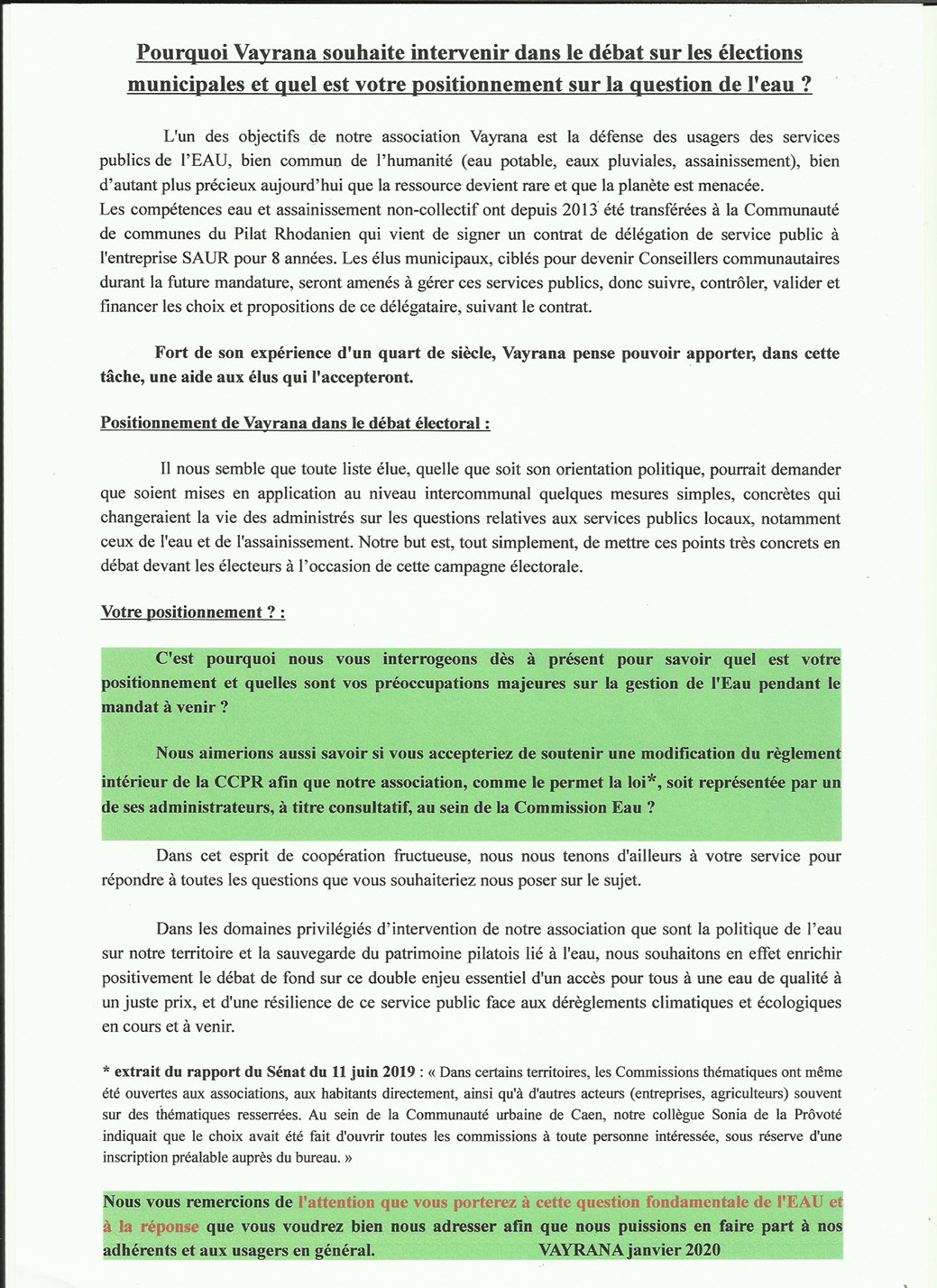 • Vayrana : l’association continue son combat contre une décision contestée du choix de la DSP et de la SAUR pour exploiter son service public d’eau potable ;